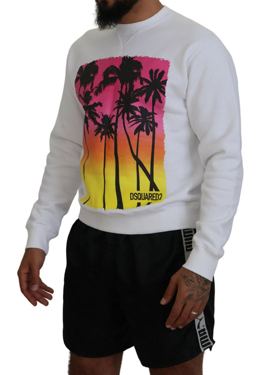 White Cotton Printed Long Sleeve Crew Neck Sweater